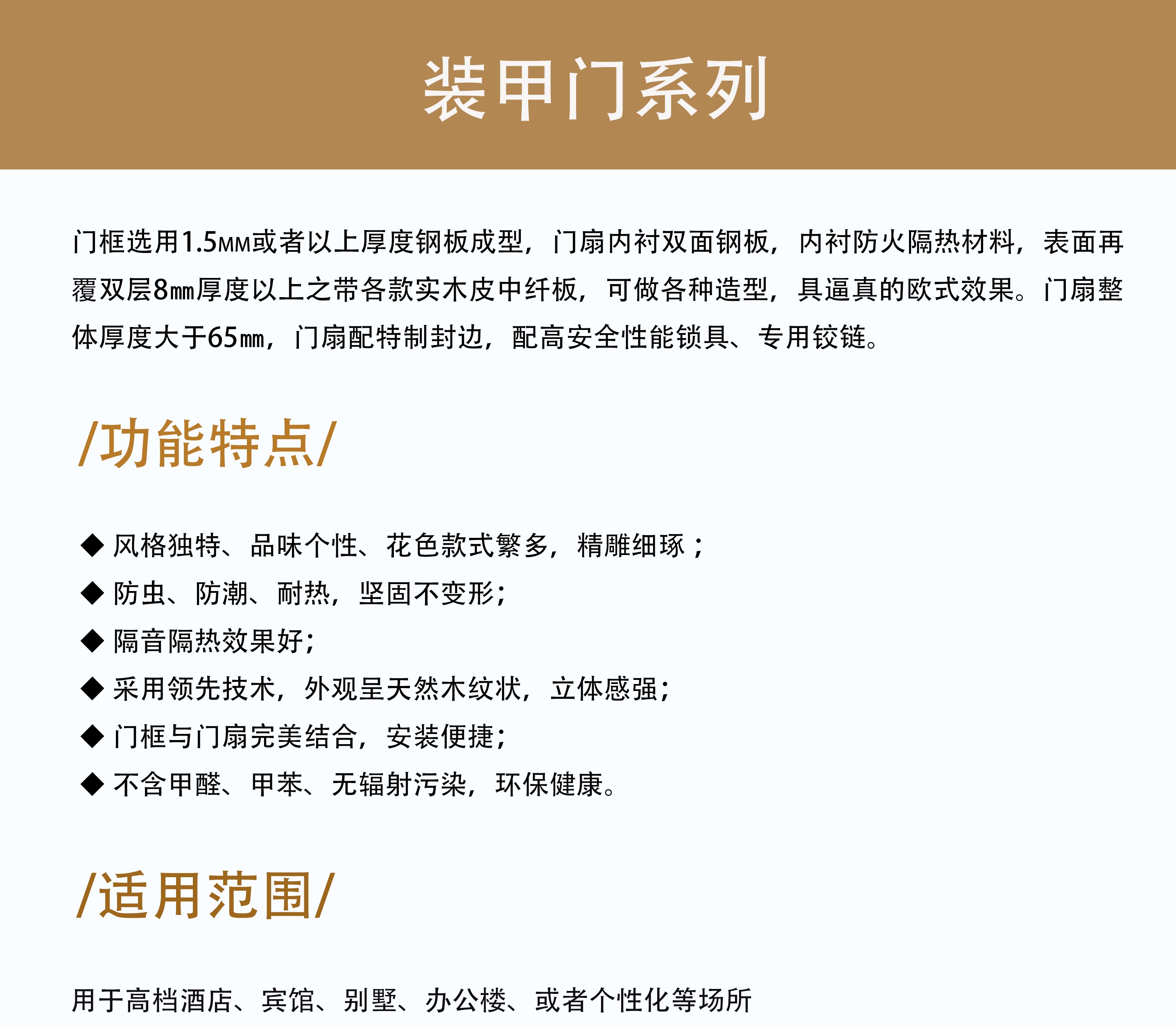 • 門面板:采用優(yōu)質(zhì)的鋼板,通過先進的復(fù)合工藝與木飾面材壓型而成